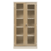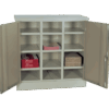 Storage cabinet with wooden doors. Full size cabinet includes 4 shelves. Half size cabinet include 2 shelves. Lockable. Melamine door with oak finish.