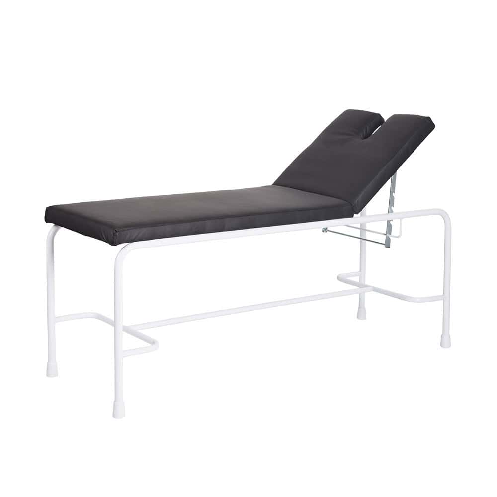 Semi-fowler examination bed epoxy coated frame with rubber feet. Adjustable backrest. (Rachet type) SIZE 1900MM (L) X 650 MM (W) X 700 MM (H) 35kg Stationary examination couch. Epoxy powder coated tubular steel frame (32mm) mounted on 4 rubber feet. The couch top comprises of 50mm thick, high density ( 64kg/m3 ), foam bonded to 16mm particle board and upholstered in a PVC material. Backrest, 609mm long, manually operated by simple ratchet. (Dimensions; width 610mm; length 1830mm; height 762mm)